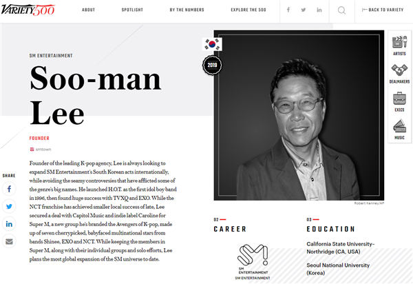 《Variety》对李秀满制作人作出了介绍,“他是风靡全球的现代K-POP的强大先驱者,正在将其旗下艺人送上世界舞台,自1996年第一代偶像组合H.O.T.出道后,成功打造出了东方神起、EXO等人气偶像组合”。