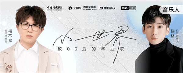 毛不易作为QQ音乐“你好,大学声”校园厂牌星推官及“00后毕业歌发起官” 发起#致00后的毕业寄语# 活动,邀请大家一起为首届00后毕业生共创毕业歌歌词,用音乐留存青春,用文字记录心声,经历全网的征集筛选,最终由校园音乐人杨格携手毛不易,共同创作和演唱这首属于00后的毕业歌——《小世界》,以写实的歌词,柔和的旋律,将00后在毕业之际对未来的展望娓娓道来。