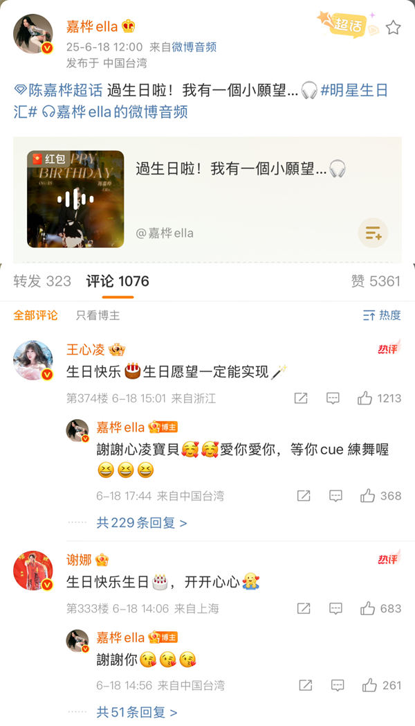 6月18日,恰逢Ella生日,不仅谢娜、王心凌等一众好友纷纷送上祝福,更有大批粉丝自发应援、祝福庆生。Ella也亲自下场“在线宠粉”于微博超话翻牌一一回复歌迷,温暖互动,Ella更是把回访粉丝应援的片段收录于释出的生日vlog中,达成和粉丝真情的双向奔赴。诸多歌迷粉丝纷纷感叹“这下你要爱Ella一辈子了”,登上话题榜成为热议话题。
