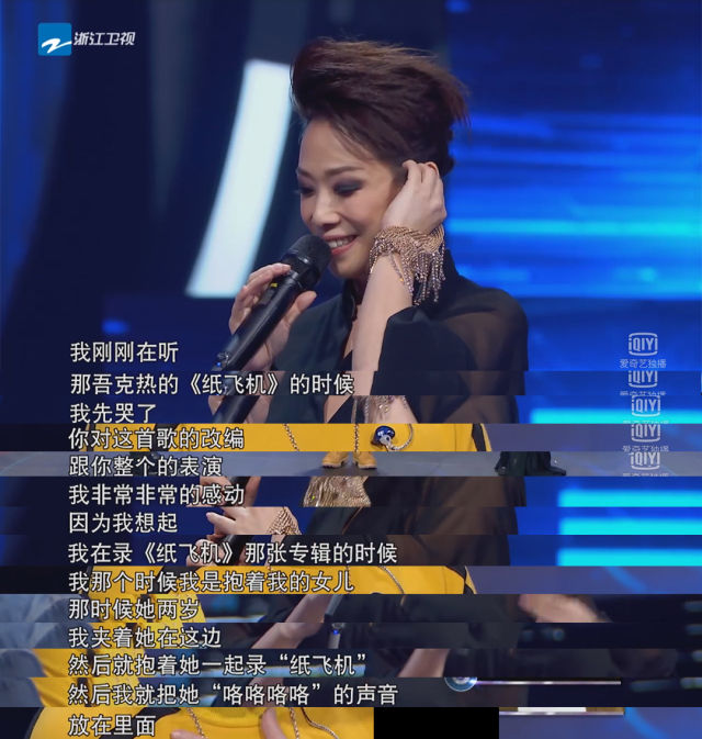 表演完sandy姐说:刚在听那吾克热唱的《纸飞机》的时候,我先哭了跟着我就笑了,你对这首歌的改编跟你整个的表演,我非常的感动,我想起当年录《纸飞机》这首歌时,抱着女儿在腿上那时候她才两岁,一起录纸飞机,录下一段她笑声作为前奏,所以忍不住哭了。