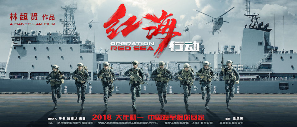 《红海行动》由林超贤导演,于冬、陆振华、唐静总制片人,梁凤英监制,张译、黄景瑜、海清、杜江、蒋璐霞、尹昉、王强、郭家豪、王雨甜、麦亨利等主演。2018年大年初一,全国公映。