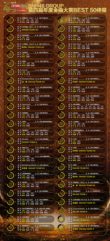 最终,由BEJ48成员苏杉杉、SHY48成员王诗蒙、BEJ48成员冯思佳 、SNH48成员张丹三四位成员共同演绎的Unit曲《春夏秋冬》,由SNH48 Team NII演绎的16人曲《光之轨迹》,分别摘得Unit 曲和16人曲的第一。这两首歌及其所演绎的成员阵容也将获得定制MV的专属回报。而此次年度金曲第一名《春夏秋冬》的Center位成员苏杉杉,还将获得个人SOLO歌曲MV拍摄的重磅奖励。