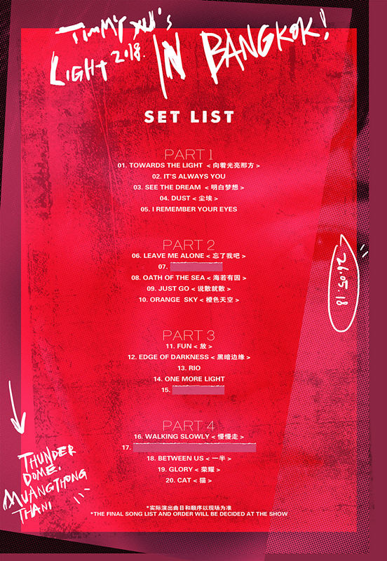昨晚,许魏洲工作室抢先公开了5月26日泰国演唱会的曲目单,20首歌几乎涵盖了许魏洲《LIGHT》和《THE TIME》两张专辑的所有歌曲,还有林肯公园的《One More Light 》以及《说散就散》翻唱歌曲,更有三首歌曲隐藏在贴纸下等待打开。据悉,歌曲与舞台的结合也设计了巧妙的视觉特效,将多维度展现许魏洲独一无二的音乐星球。 “Light”作为许魏洲演唱会专属品牌,2016年出道至今共开六场,每一场无论是舞美设计,还是曲目编排、以及许魏洲的造型都会有新的变化。5月26日Light亚巡泰国站将在上海站基础上又一次全方位升级,风格化的舞台视觉,LIVE的舞台表演,将为现场歌迷带来人耳目一新的立体视听感受;造型一直以来也是许魏洲演唱会上一大看点,此次演唱会他也将尝试多套突破性服装造型,期待5月26日少年光芒闪耀。
