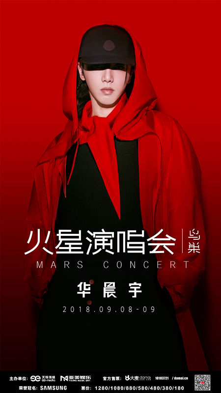 主海报中华晨宇以抢眼黑、红、白三色视觉示人,黑色鸭舌帽遮住半张面孔,神秘深邃而立体的面孔像一只飞鸟的造型,红色的领巾和斗篷如鸟类的羽毛般鲜艳乖张,却又不失时尚的潮酷气质。全身黑与红极具“锋利”美感,干净利落的几何式构图尽显华晨宇简约的自我态度和能量,仅凭一人,站在舞台上,就能创造出自己的黑洞世界,带领观众的听觉情绪进入他的魔力音乐空间。主海报摄影依然采用红色滤光,形成统一强烈火星红色。红色是华晨宇最喜欢的颜色,也是火星人的象征色。白色“火星演唱会”和“MARSCONCERT”在画面中点睛一笔,显得更加摄人心魄,静待即将步入鸟巢红海的最终时刻。