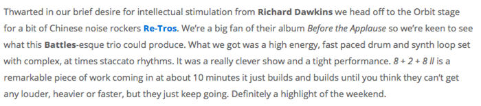 这是重塑第一次在英国的音乐节表演,却获得相当乐观的反馈,英国音乐媒体Getintothis就给出了“当日演出最大亮点”的超高评价。