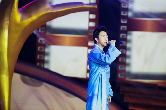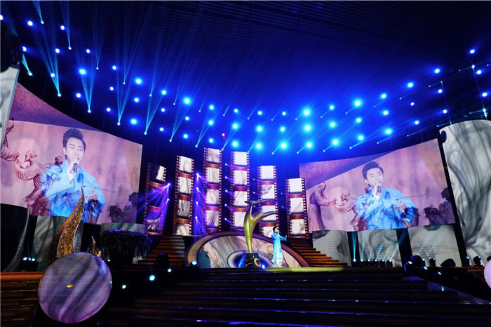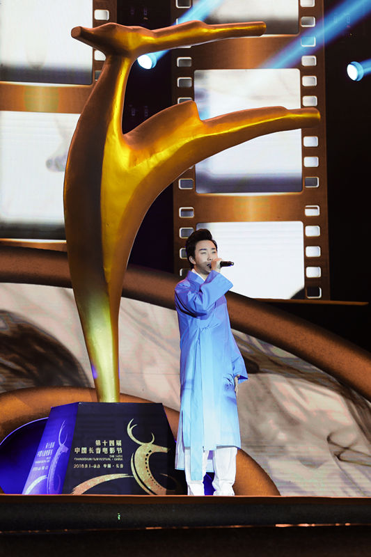 晚会不仅召集优秀的主持班子,还准备了一系列多丰富多彩的节目。其中,李玉刚身穿浅蓝色渐变长袍,清新大气,衣间长带垂落,更显飘逸超尘。精彩的演出更为电影节增添了一大亮点。李玉刚现场演唱两首经典曲目《刚好遇见你》、《李》,一上台便引来掌声无数,曲毕后掌声经久不息,观众意犹未尽,仍沉浸在饱满婉转的歌声中。