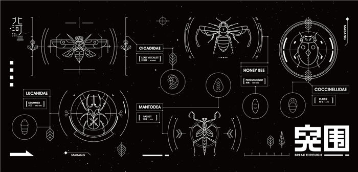 五只昆虫对应乐队的5位成员,一鸣惊人、声声不息的帝王蝉,是视音乐为一切的乐队主唱阿钢;天生战士的锹甲,是乐队中的智者担当鼓手小刀;平日里朴实无华关键时刻厚积薄发的瓢虫,是乐队中的吹奏阿飞;勤劳朴实顾家的蜜蜂,是乐队中的小打梵枫;天生好斗有韧劲的螳螂,是乐队中后生可畏的贝斯手阿渝。