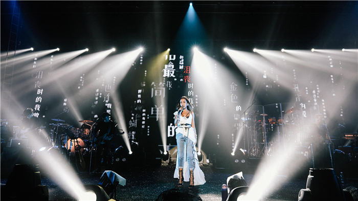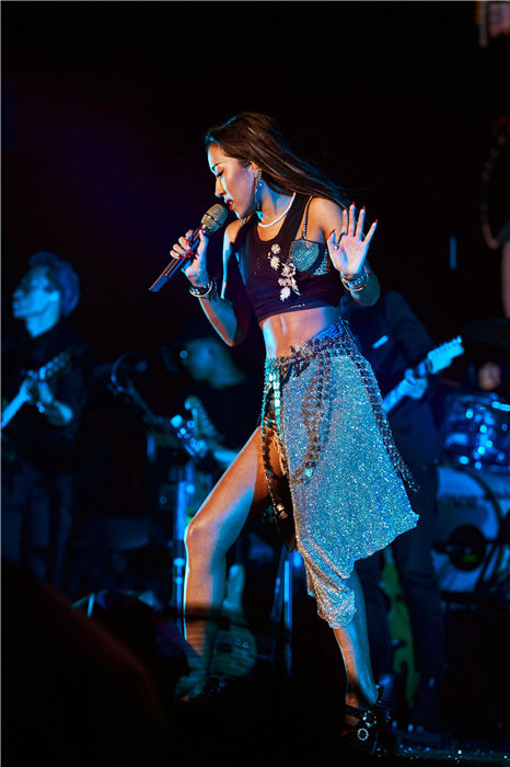 当天,吉克隽逸一袭黑色披风亮相,搭配深V白裙,黑色铆钉腰带与白色腰带的双腰带配置和黑色网状细高跟的搭配,与整体的黑白元素相得益彰,内衬铅笔裤,混搭时髦帅气。演出过半后,吉克隽逸更换战服,Bling Bling的内衣与不规则剪裁的裙子相呼应,配上同样闪亮的耳饰和手镯,宛如夜空中的一颗星,性感而华丽。