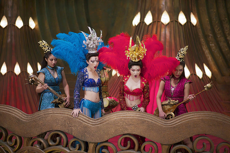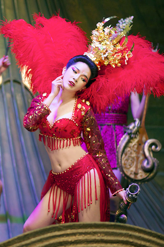 身着一身性感红衣的艾菲头戴金色冠顶,她饰演的是一位斗武场的美艳歌姬,她也是王力宏饰演的乐无异一走进便被吸引目光的歌舞女郎,身姿曼妙,充满着张力与诱惑,她的歌舞表演将整个斗武场的基调展现的淋漓尽致,同时也衬托着这里暗藏漩涡的机遇与危机。