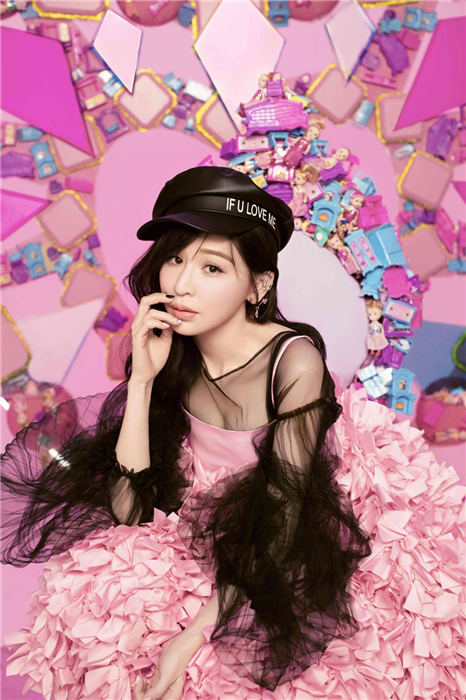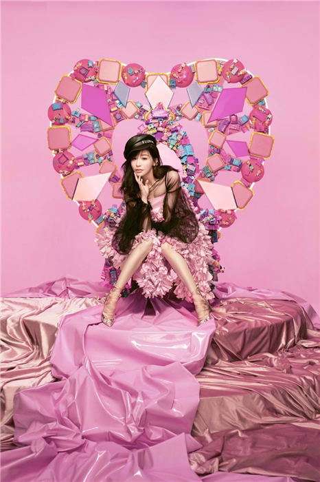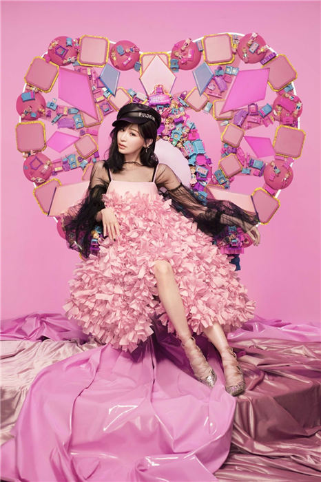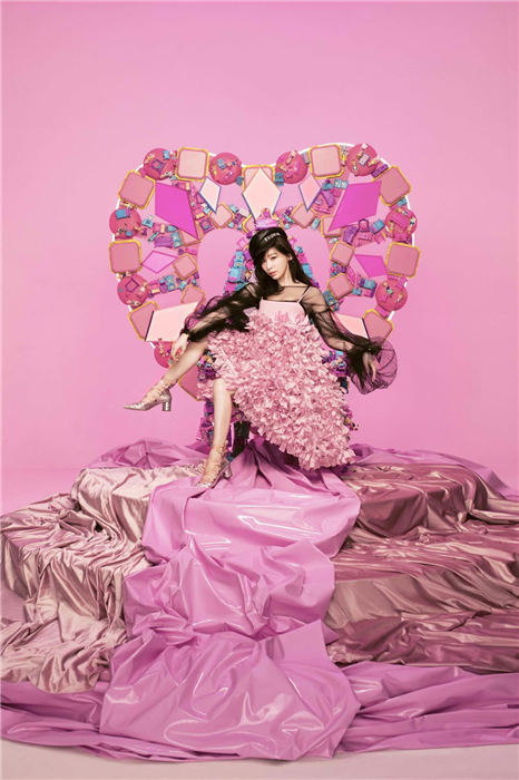 这套“粉爱妮”宣传照,王心凌专门赴北京与当地的团队合作拍摄。粉色代表她以往的甜美,造型蓬蓬裙来自设计师品牌ANNAKIKI,特别从米兰秀场空运到现场,不按牌理的和黑纱上衣结合,颠覆出一种态度感的甜美,搭配黑色皮革帽,在细节中感受到不同于以往的变化;而背后的华丽宝座,由可爱的二次元元素打造,彩色钻石和玩偶装饰拼组,象征可以是高贵女王也可以是俏皮公主!