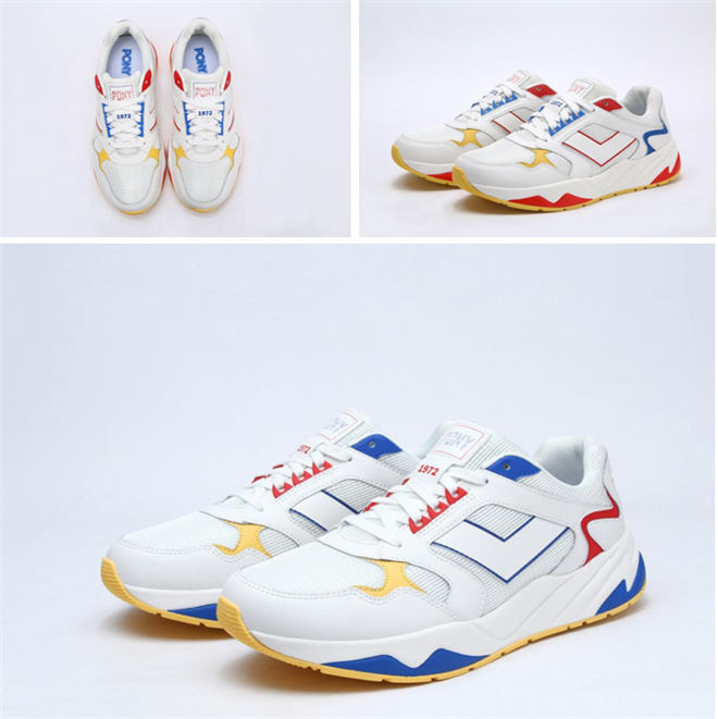 馒头鞋不仅拥有全新的鞋型,全新的配色也正式浮出水面,带来了前所未有独一无二的视觉冲击体验,主打高饱和度的三原色---红黄蓝色巧妙地点缀分布在纯白色鞋身上,年轻充满朝气,让人眼前一亮爱不释手,清新抢眼的撞色搭配极具感染力,为春夏注入活力气息;除了时髦抢眼的标致红黄蓝配色外,PONY也为近年掀起的NORMCORE潮流做出了新的诠释,推出了纯白色款和黑白配色款,永不过时、极为干净简约的纯白色馒头鞋,无论出入何种场合、如何进行搭配都不会出错;而帅气干练的经典黑白配色款,也将“土味球鞋”所带领的潮流感引向极致,无疑也是休闲运动及日常出街的首选。