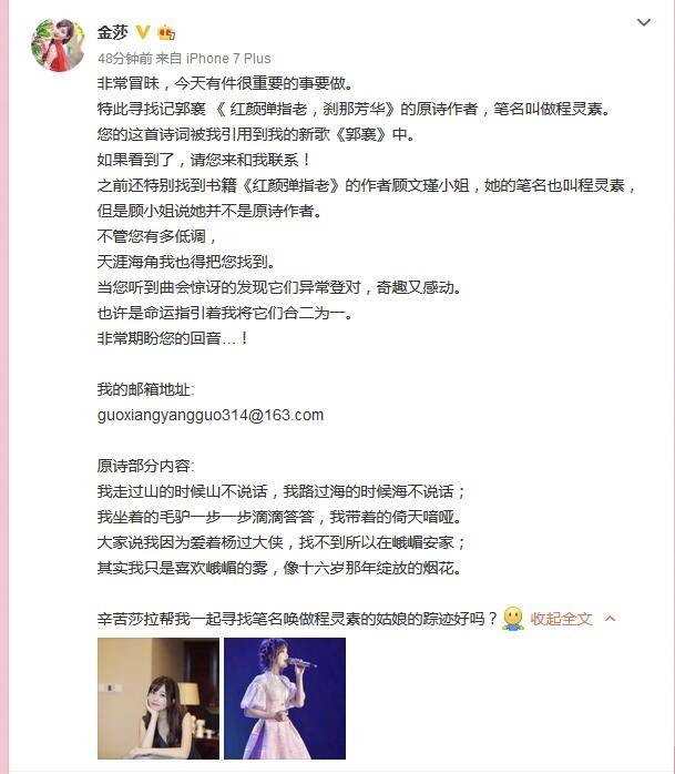 金莎发长文寻找某诗原作者 获网民点赞无数