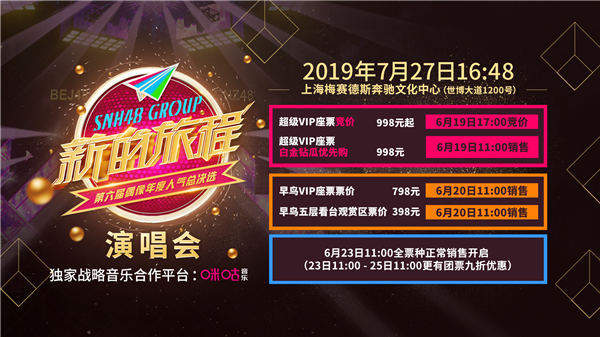 秀网娱乐讯,“新的旅程”SNH48 GROUP 第六届偶像年度人气总决选演唱会暨结果发布仪式将于7月27日隆重举行,举办场馆为上海顶级文化演出场所——梅赛德斯奔驰文化中心。本届演唱会将由 SNH48 GROUP 三地姐妹团近200名成员共同参与,现场揭晓将本年度 TOP48 成员的排名,并由独家战略音乐合作平台咪咕提供全程支持。总决选演唱会在6月19日迎来首次开票,除了通过SNH48官方商城购买,其他平台也将同步开启部分票种的销售。