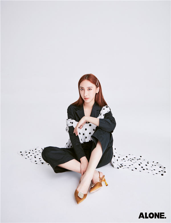 拍摄中,许靖韵大胆采用色彩碰撞,彰显时尚态度。蓝,橘这样的颜色能够展现出少女满满的青春活力,同时增添更多的时尚气息,高饱和度的色彩能够具有一定的视觉冲击感。黑色连体西装裤与白色波点外裙搭配,随意却不失别致,色彩简单也十分吸睛。
