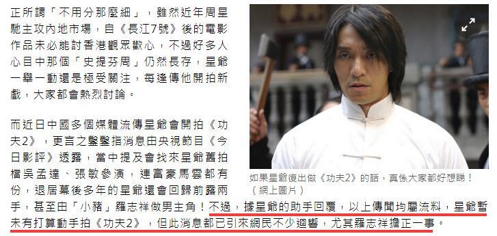 传星爷要亲自参演《功夫2》?助理辟谣:假的