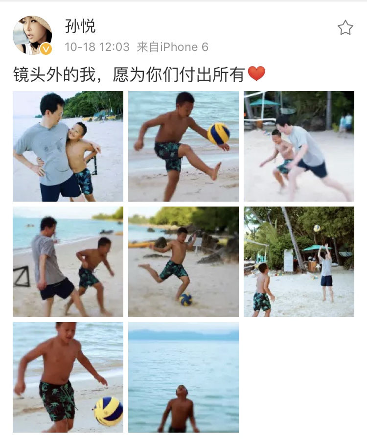 秀网娱乐讯,10月18日,歌手孙悦在微博晒出老公和儿子一起沙滩足球的温馨照片,并配文“镜头外的我,愿意为你们付出所有……”立刻引众多粉丝感动。